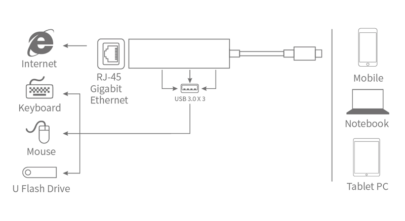 USB-C to 3-Port USB 3.0 Hub with Gigabit Ethernet adapter is designed for connecting computer or notebook with built-in USB-C connector to USB devices such as external drives mobile devices or storage device. With USB-C interface, you can access USB 3.0 Hub and Gigabit Ethernet at the same time.