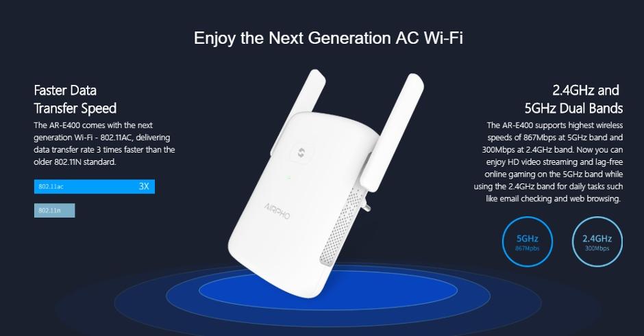 AIRPHO AR-E400 AC1200 Dual Band Expand High-Speed Wi-Fi to the Farthest Corner of Your House