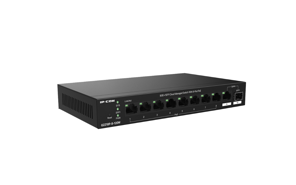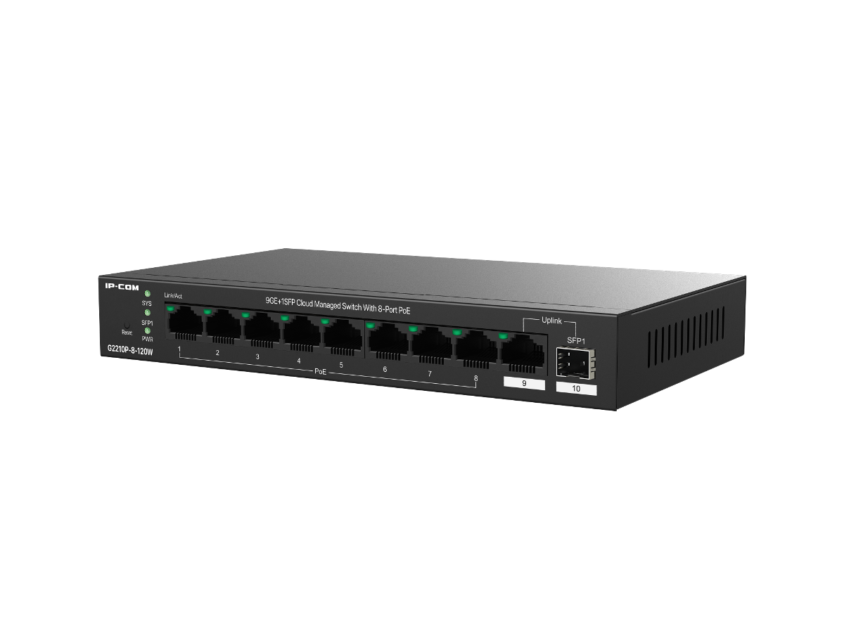 SWITCH (สวิตซ์) IP-COM G2210P-8-120W  9 Giagbit ports (8 PoE ports), 1 ×  100/1000 Base-X SFP port, power budget 110W