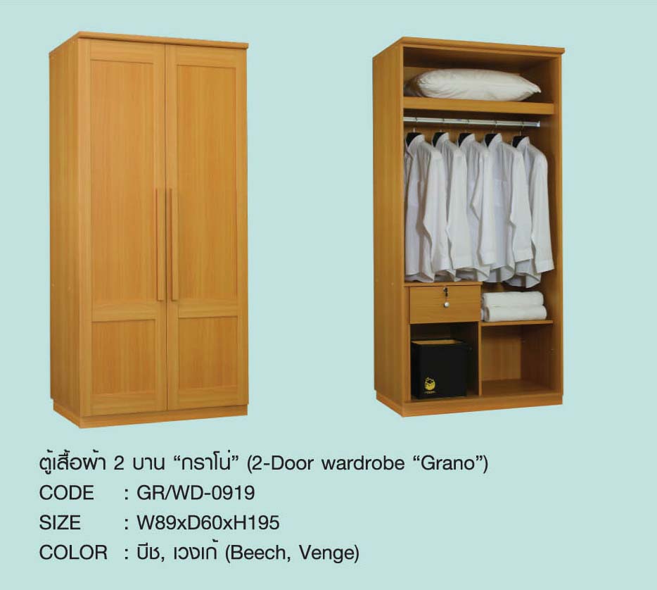 เฟอร์นิเจอร์ไม้ : ตู้เสื้อผ้า 2 บาน "กราโน่" มี 2 สี