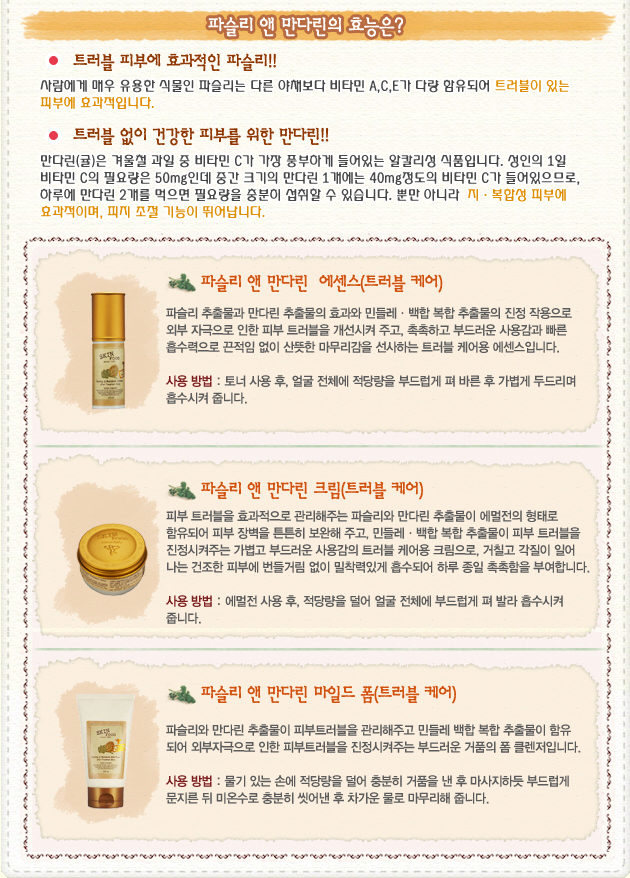Parsley & Mandarin Essence เอสเซนท์เนื้อบางเบาฟื้นบำรุงผิวอย่างล้ำลึกถึงผิวชั้นใน ด้วยMandarin พืชธรรมชาติซึ่งอุดมไปด้วยวิตามินซี ยับยั้งและกำจัดเชื้อแบคทีเรียซึ่งเป็นสาเหตุของการเกิดสิวพร้อมควบคุมความมันส่วนเกินบนใบหน้า ผสานด้วย Parsley