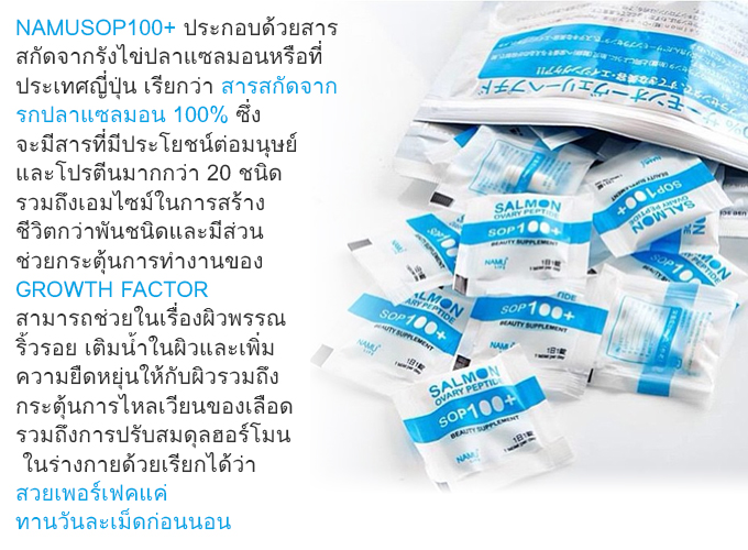 เป็นที่ทราบกันอย่างดีว่า ที่ญี่ปุ่นนิยมทานคอลลาเจนกันมาก แต่คุณสาวๆ ทราบหรือไม่ว่า คอลลาเจนที่สาวๆ ญี่ปุ่นนิยมทานกันในตอนนี้ คือ Namu salmon ที่ครองใจสาวๆ ญี่ปุ่นมาแล้วทั้งประเทศ เพราะด้วยคุณสมบัติที่เลอเลิศต่างจากคอลลาเจนทั่วๆ ไปที่คอลลาเจนที่เคยผลิตจากรกสัตว์ที่ผ่านมา ก็จะมีแค่ จาก รกม้า รกแกะ รกหมู แต่ Namu Salmon สกัดมาจากรกของปลาแซลมอนใต้ท้องทะเลลึก เป็นดั่งแหล่งรวมคอลลาเจนบริสุทธิ์ชั้นหนึ่ง แค่นี้ก็พลาดไม่ได้แล้วคะ